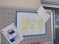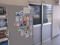 絵手紙クラブの子ども達が作った作品を北校舎1階の廊下に掲示しています。子ども達は牛乳パックを利用して、台紙を作り、その上に絵手紙を描きました。渡り廊下は子ども達の作った様々な作品が彩られて、すてきな空間となっていました。