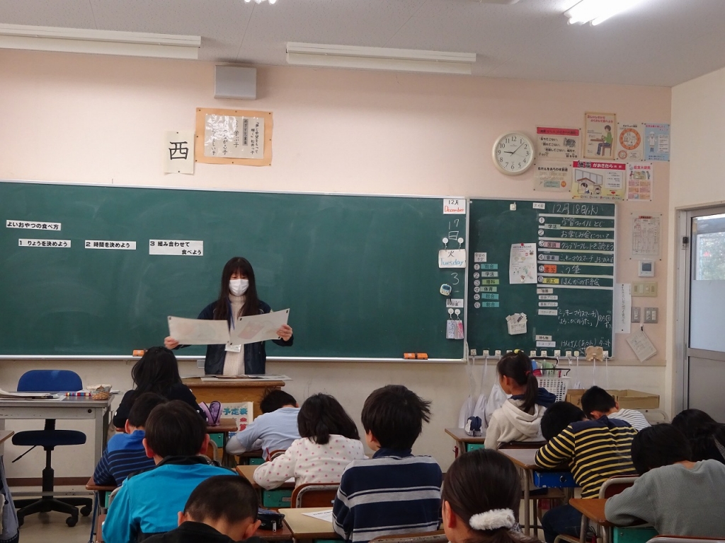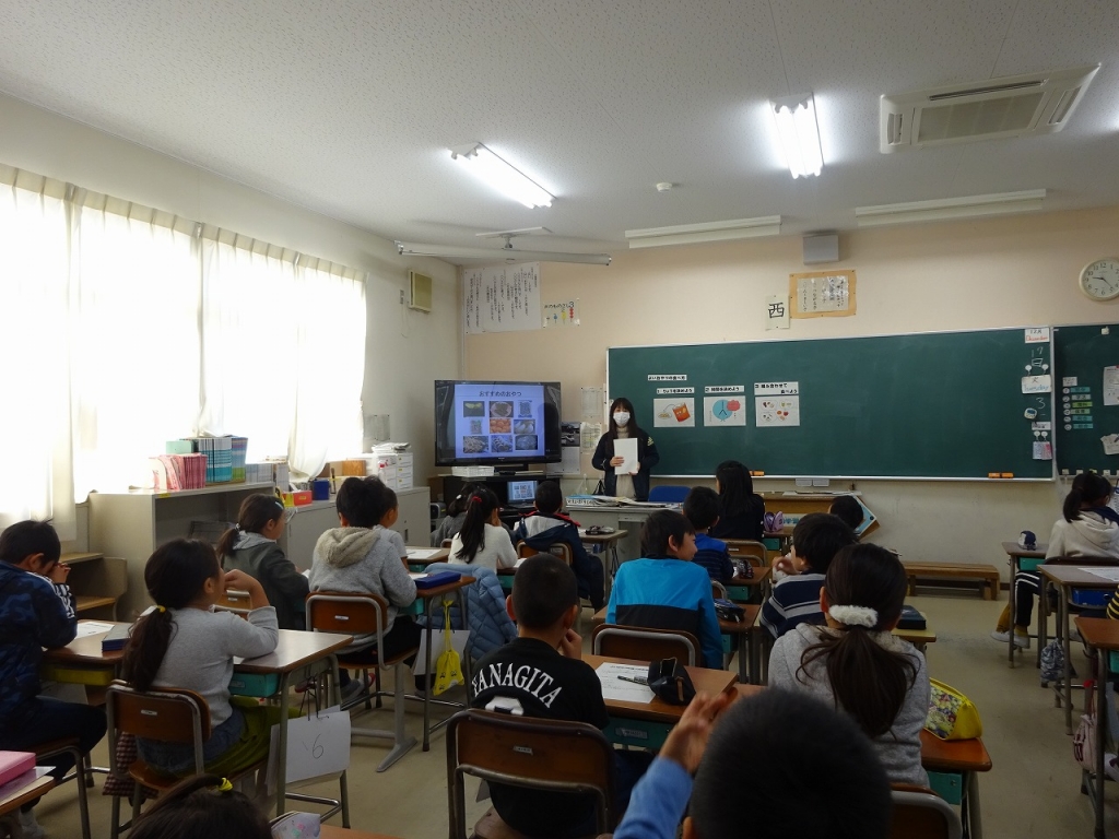 3年生では、栄養教諭の三上先生の授業で、「よりよいおやつの食べ方」について学習しました。