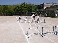 4年生の児童が体育の学習でハードル走に取り組んでいます。ハードルを少し怖がる児童には、真ん中が少し空いていて、バーが前後に動くハードルも用意されていて、個人個人に応じた練習を行っていました。子ども達は先生の指示に従って、歩幅を意識して飛び越す練習を一生懸命行っていました。