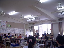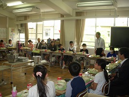 「えらいさんが来た~。」という一言で、教室は静まり返りました。自己紹介の後、市役所の方から、20周年の取組や、京田辺市についての話をしていただきました。「いただきます」をした後、静かな時間もありましたが、市役所の方から給食に関するクイズを出してもらい、正解するたびに盛り上がり、緊張していた給食の時間があっという間に終わりました。