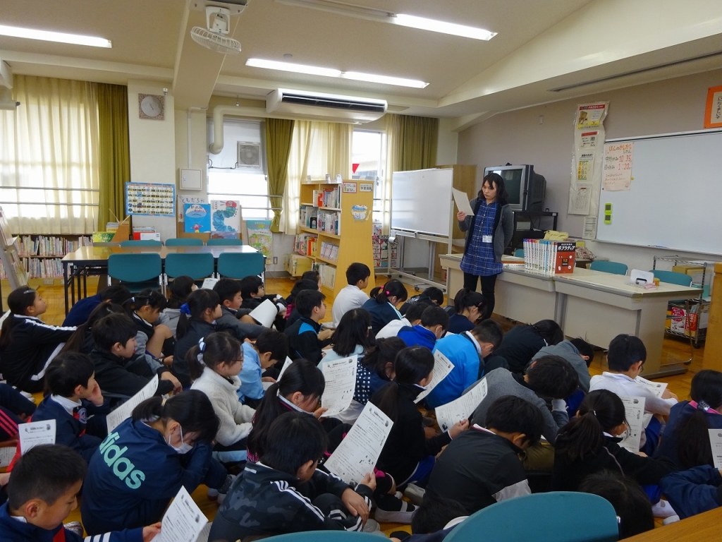 国語の学習で研究レポートを書くために、司書の先生に百科事典の使い方についてお話を聞きました。