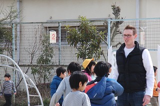 今日は、国際理解教育の一環として、アメリカ人のスコットさんと