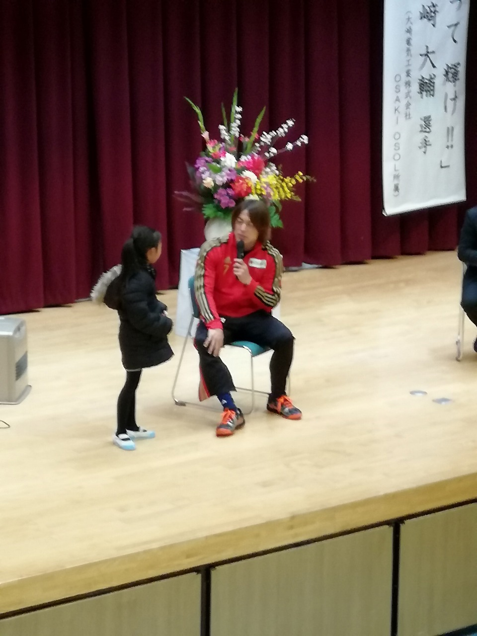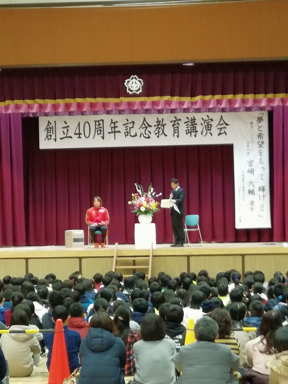 男子ハンドボール日本代表の宮﨑大輔選手(大崎電気工業株式会社 OSAKI OSOL)をお招きし、「夢と希望を持って輝け!!」のテーマに沿って、インタビュー形式でお話をしていただきました。
