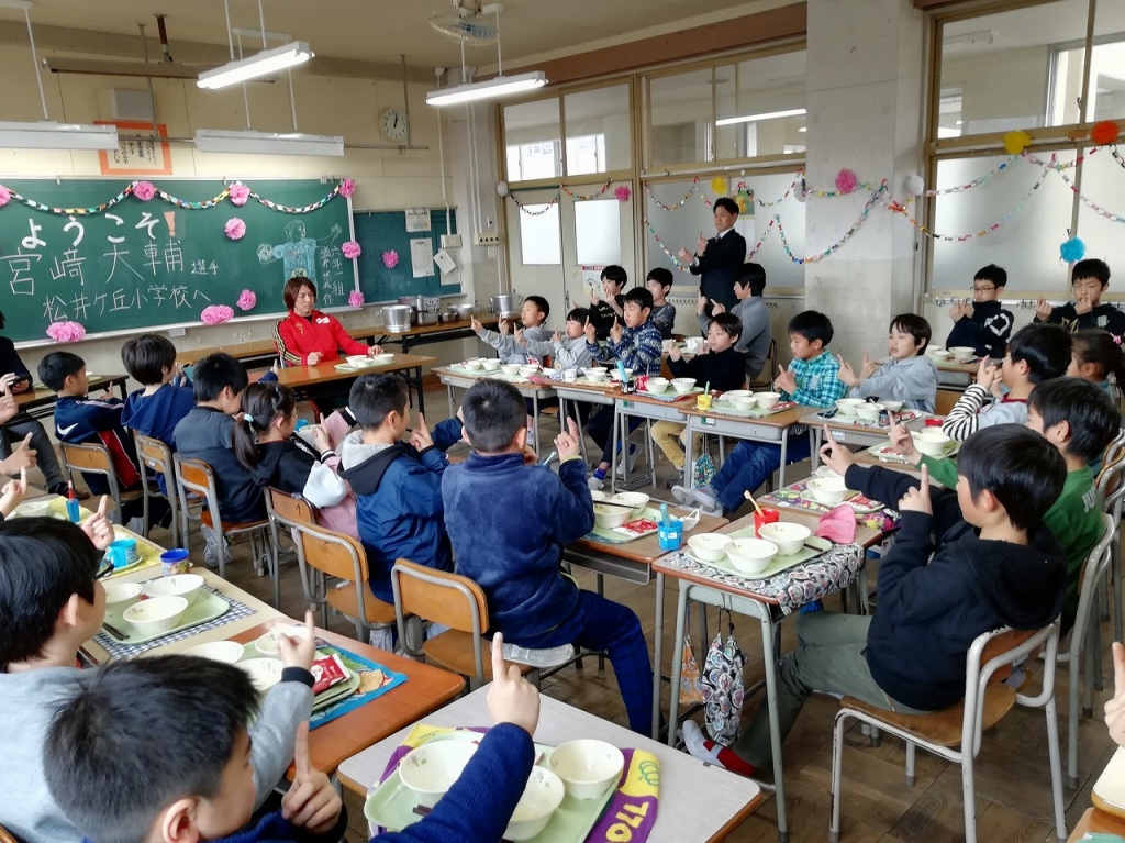 給食では、3年生以上の各クラスから選ばれた計40名が宮﨑選手と一緒に給食を食べました。
