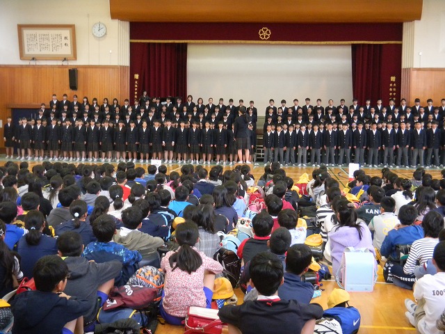 最初に、中学校2年生の学年合唱を聴きました。きれいで力強い歌声に圧倒され、児童は2年後の姿として憧れを抱いていました。そして、生徒会から1年間の流れを教えてもらい、中学校生活に見通しがもてているようでした。