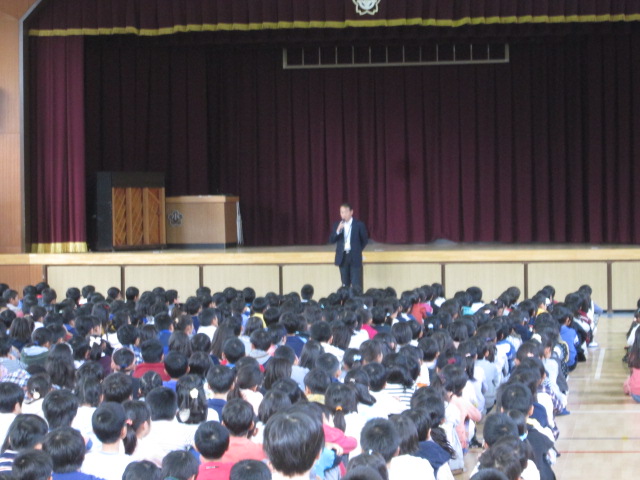 本日、不審者の侵入を想定した避難訓練を実施しました。不審者が侵入した時の放送指示や、避難方法を確認しました。訓練後は体育館に集まり、校長先生から安全に避難するためのめあてを再確認しました。