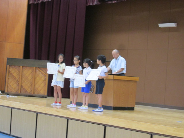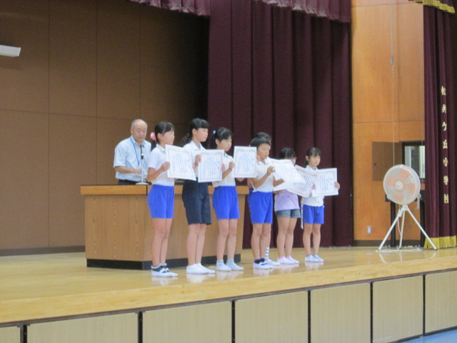 出品し、賞をもらった児童が、全校の前で表彰されました。