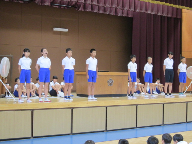 前に立った児童は、みんなが、堂々と大きな声でスローガンを伝え、