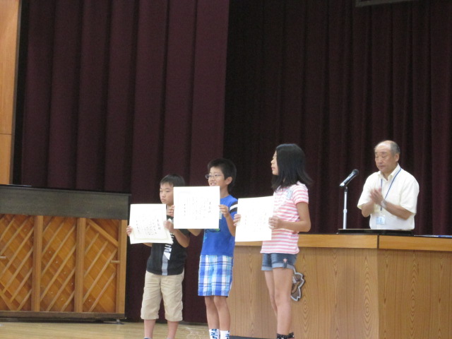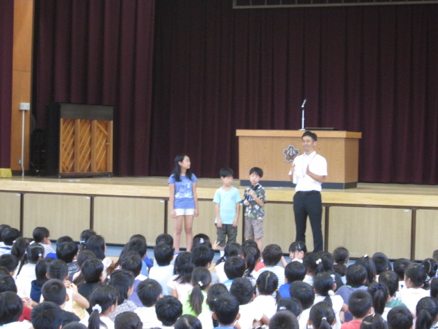 エコポスターで特選に入った児童が、全校の前で表彰されました。