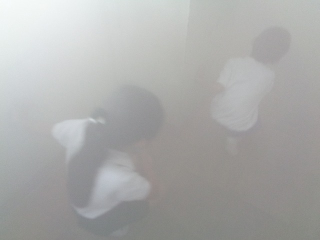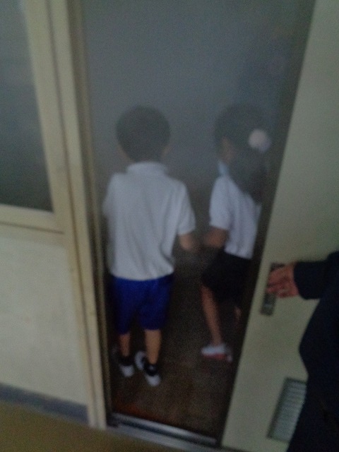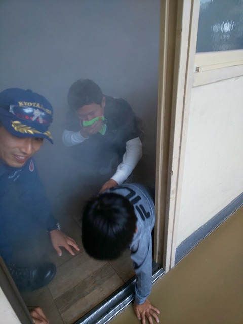 スモーク体験は、火災を想定した訓練です。煙を充満させた部屋に2人1組で入り、視界が悪いなか低姿勢を保ったまま壁をつたい、出口へと向かいました。子どもたちは、煙をできる限り吸わないようにハンカチで口を覆いながら安全に出口を探すことができていました。