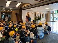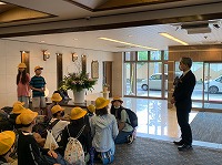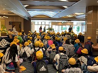 部屋に戻って荷物をまとめ、ロビーに集合して退館式を行いました。 友だちと過ごした1泊は貴重な体験になったことと思います。 次は、玉ねぎ収穫体験です。昨日の夕食にも玉ねぎが出ました。淡路島の有名な玉ねぎ。玉ね ぎは、どうやってできるのだろう?