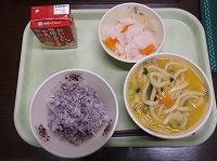 この日は2学期の最後の給食でした。メニューは「味噌煮込みうどん、ゆかりごはん、こかぶの柚子香あえ、牛乳」でした。寒いこの時期に温かいうどんが提供され、体も心も温まりました。2学期の間、給食に携わっていただいた皆様ありがとうございました。