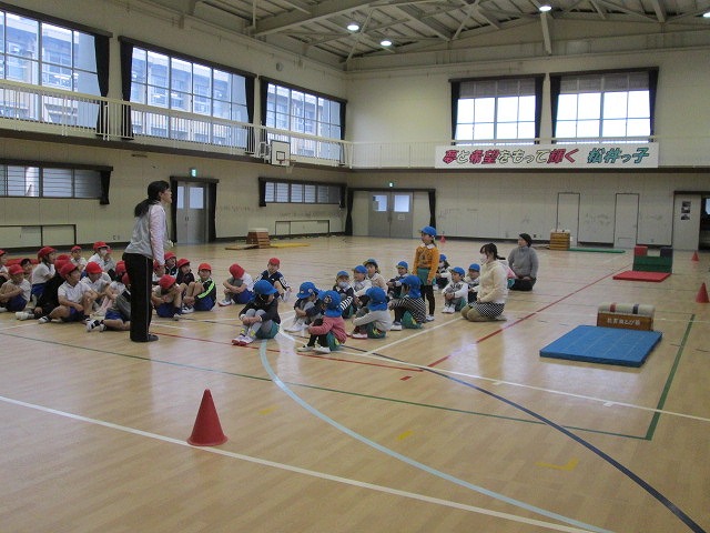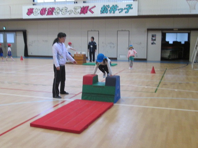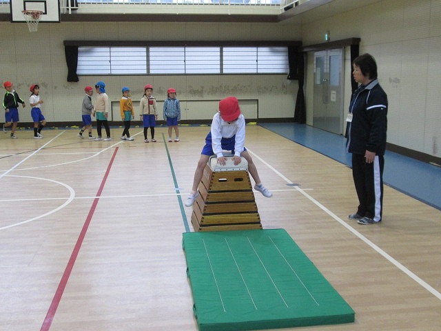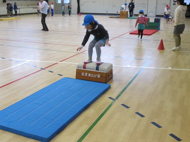 本校体育館で、児童と一緒に跳び箱遊びをしました。 「楽しかった。」と多くの園児が感想を言っていました。
