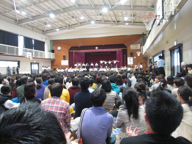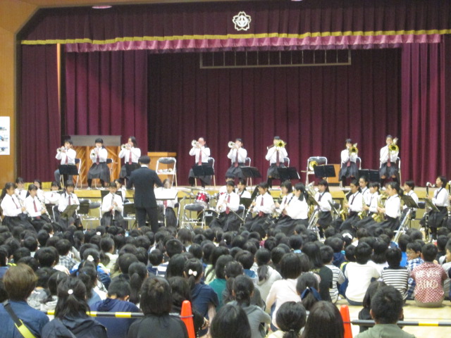 大住中学校吹奏楽部は、ここ数年間毎年、本校児童のために演奏に来てくれています。素晴らしい楽器演奏だけでなく、踊りを取り入れて楽しく観せてくれたり、校歌の演奏とともに歌わせてくれたりと、45分間、子ども達は釘づけでした。
