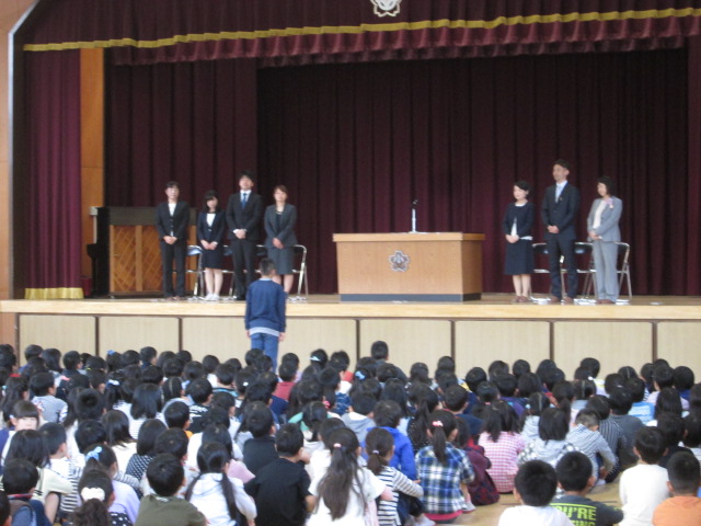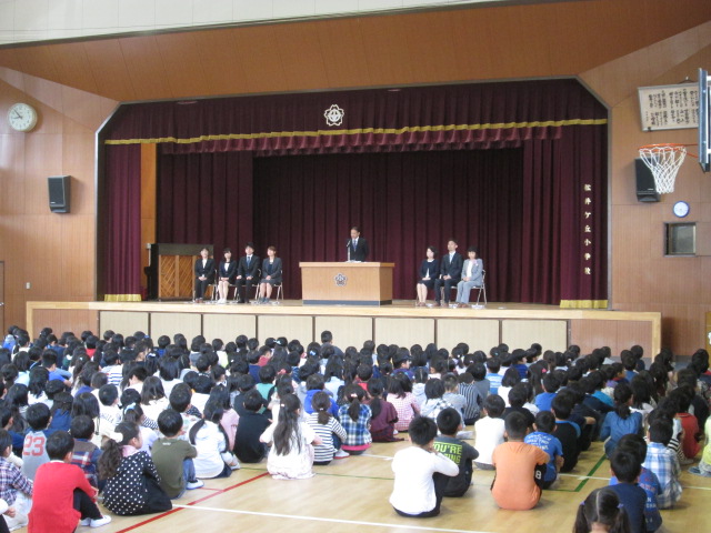 平成29年度を終えて、11名の先生が退職・転任となり、そのうち7名の先生方が児童の前で、離任の挨拶をしました。