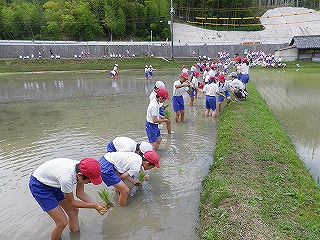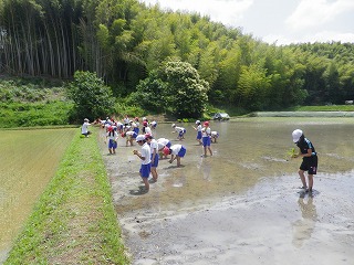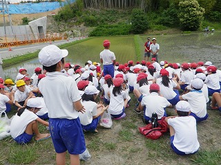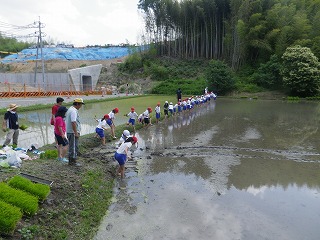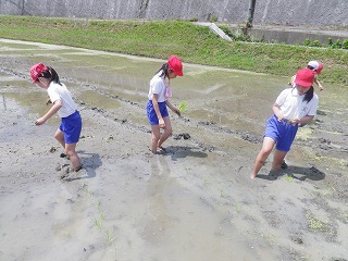 5年生は、先週から延期になっていた田植え体験を行いました。