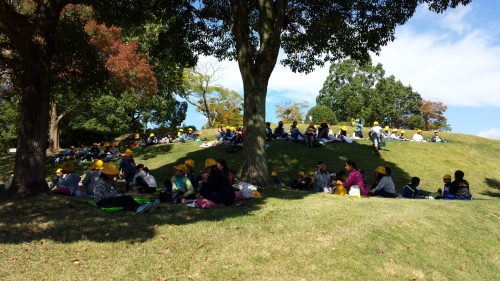 待ちに待ったお昼ご飯です。お家の人が作ってくれたお弁当を美味しそうに食べています。相変わらず良いお天気です。