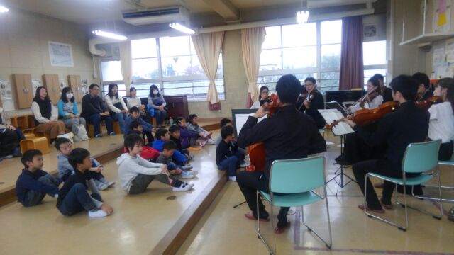 弦楽アンサンブル団体『アンサンブル都』から9名の演奏者の方に来ていただき、クラシックの名曲から子どもたちにもよくわかるジブリやディズニーの曲まで、幅広いジャンルの曲を弦楽器ならではの優雅な音色で演奏していただきました。