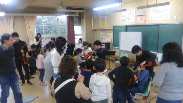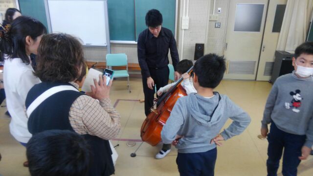 目の前で弦楽器の演奏を聴くことができ、とても贅沢な時間となりました。鑑賞の後は、なんと、バイオリン、ビオラ、チェロの演奏体験までさせていただきました。演奏の仕方に戸惑いながらもやさしく丁寧に教えていただき、うまく音を出せた時はとても嬉しそうでした。
