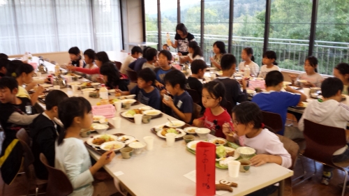 たくさん歩いたので、みんな美味しそうに食べています。食後はキャンプファイヤーの予定です。