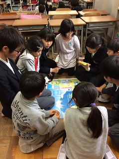 各教室に分かれ、中学生が作った防災マップを紹介してもらい、地域の危険なところなどを教えてくれました。その後、防災駅伝というすごろくゲームをして楽しみました。