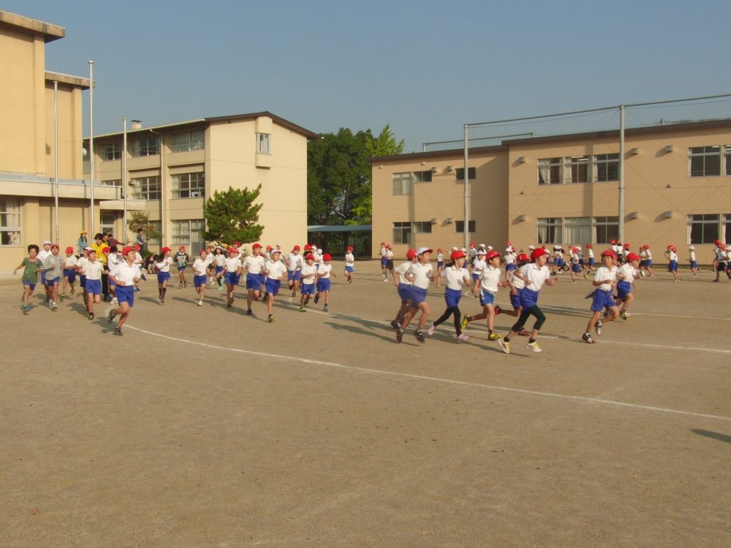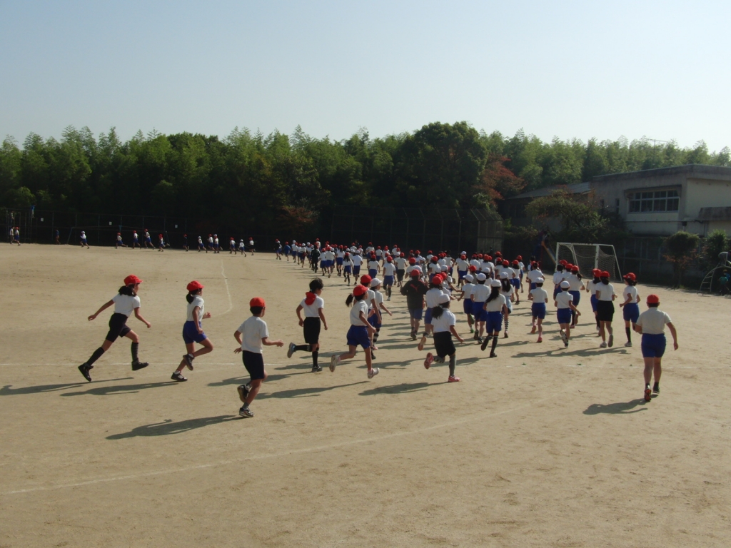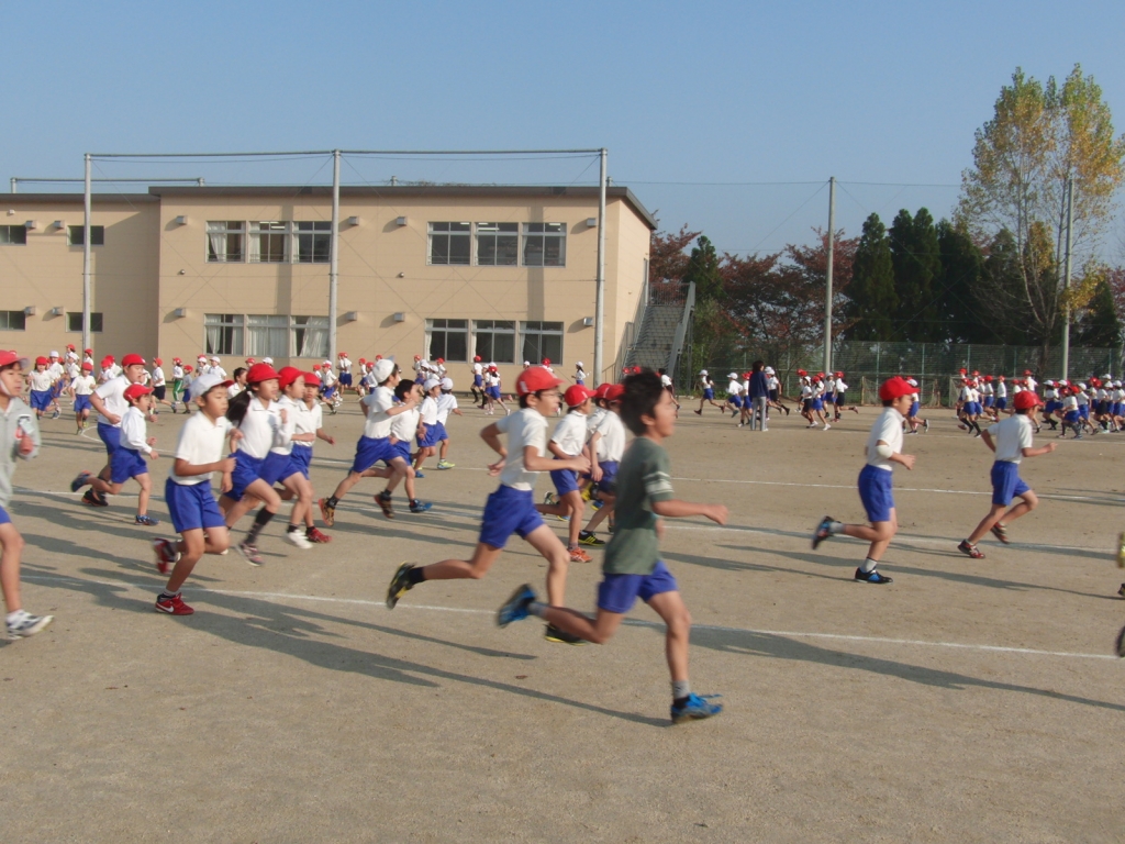 全校児童が11月下旬のマラソン大会に向けて休み時間にグランドを走っています。