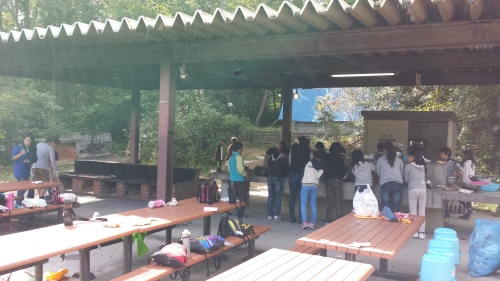 食べた後は、しっかり後片付けです。来た時よりも美しくを合言葉にみんなで頑張っています。心配されたお天気は回復し、日差しが戻ってきました。
