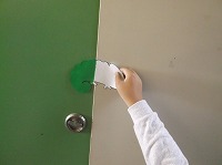 5年生が図画工作科の学習で、カメレオンの形に切り取った白い画用紙に色や模様を描き入れ学校内の風景に溶け込むようにしました。子どもたちは学校内のあらゆる場所を探して、汚れやキズの様子のつぶさに観察して、カメレオンを上手に隠していました。