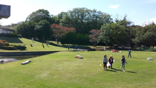 広い芝生で気持ち良さそうに走り回っています。