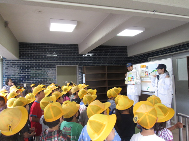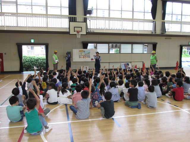 本日、2・3・4校時、1・2年生児童を対象に交通教室を行いました。田辺警察暑から3名、交通ボランティアさん2名、計5名の方に来ていただきました。