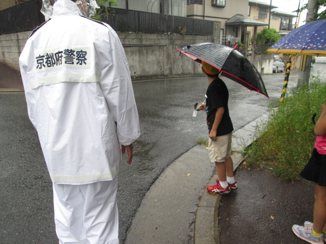 2年生は、あいにくの雨で、傘を差しながらの体験になりましたが、実際に外に出て、交通安全の大切さについて学習しました。