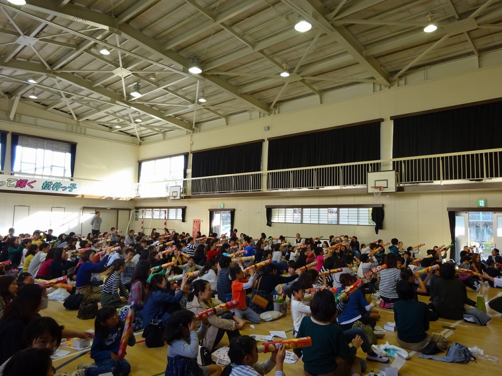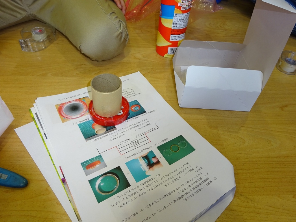 事前に家で穴をあけてきたお菓子の筒に、レンズを貼りつけて、