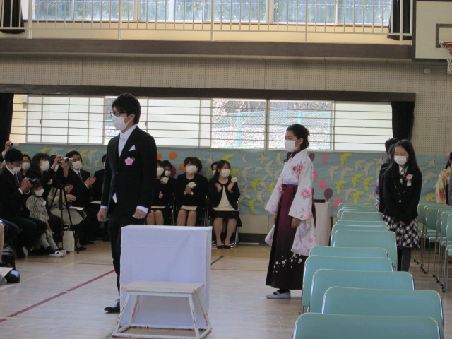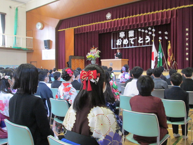 コロナウィルス感染予防のため、3月3日より休業となり、式に向けての練習も十分に取り組めませんでしたが、6年生144名は、立派な姿で一人一人証書を受け取り、凛々しい表情で小学校から巣立っていきました。