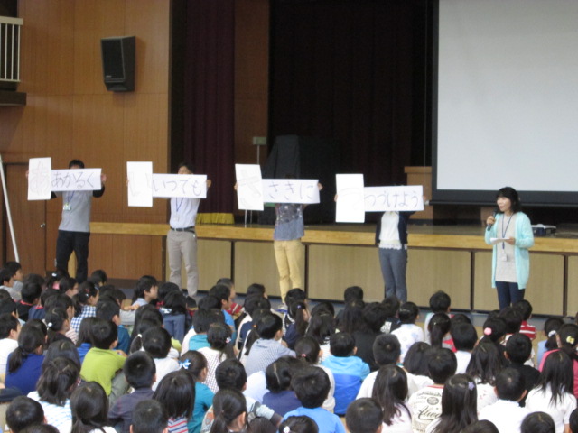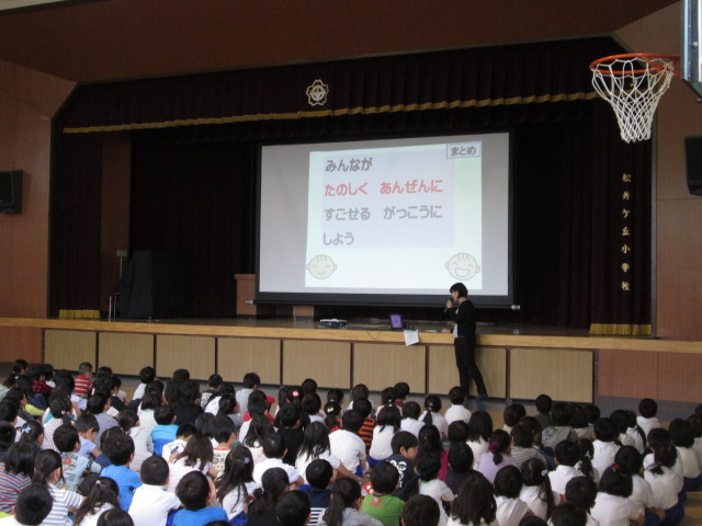 ともだちには、いろいろな人がいます。どんなことで困っているのか、どんな悩みをもっているのか、例えば、けがをして松葉づえをついている人のように、見ただけで分かる人と、勉強がわからなくて困っている人のように、見ただけでは分からない人がいます。みんなが安全に安心して楽しく学校生活を送るために、「ろうか・階段は走らない、下駄箱ではおさない」「友達が傷つくことをしない・言わない」「どうすればいいか、しっかり考えよう」ということを全校で確認しました。