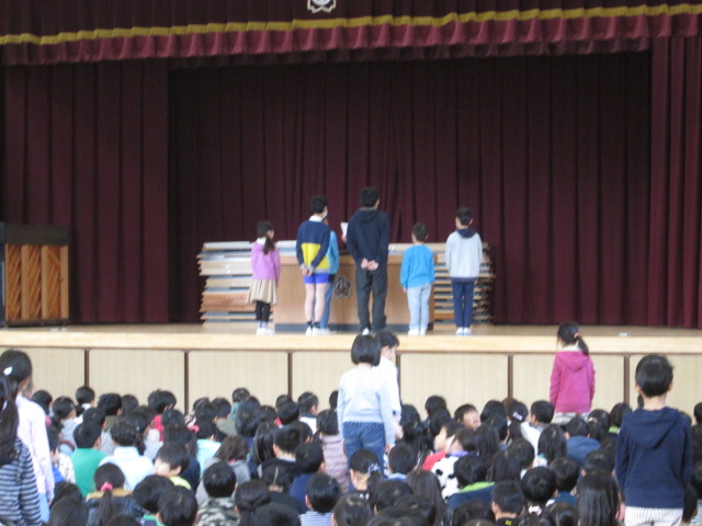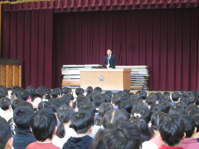 まず初めに、校長先生からのお話しがありました。校長先生からは、3学期も残りわずかとなり、1月に立てた目標が達成できましたか? そのために、一生懸命がんばりましたか? 最後まであきらめずがんばってほしいとお話がありました。