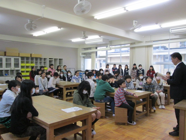 今日はお話バザールがありました。これは、担任や担任外の教師が高学年の児童にお勧めの本を読み聞かせするという取組です。 子ども達は事前に聞きたい本を選び、当日の朝にその本が読まれる教室へ移動します。どの先生が読んでくれるかは、来てからのお楽しみとなっています。子ども達は読み聞かせされる本や絵本を食い入るように聞いていました。 これで今年度のバザールはすべて終了です。今後も子ども達が色々な本との出会いができるよう、取り組めたらと思います。