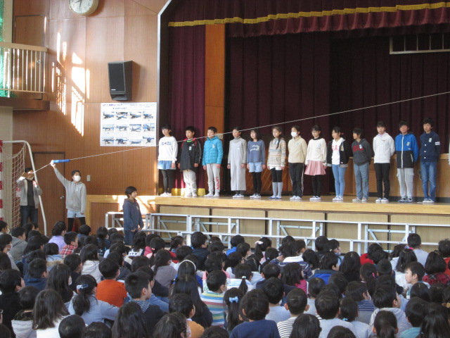 体育委員会からは、今年度の体力測定の結果を受けて、ソフトボール投げの力を伸ばすためのバトンスローについての説明がありました。休み時間に体育館に行って練習できるので、たくさんの児童が参加して、長い距離を投げられるようになればと思います。