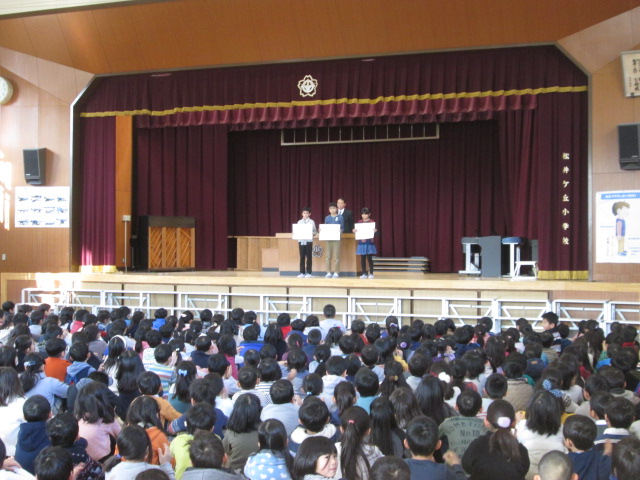 本日の児童朝礼では、体育委員会からの発表、表彰を行いました。
