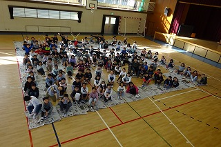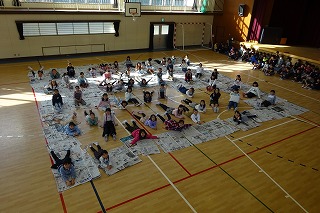 算数の授業で作っておいた「1㎡」の新聞紙を、体育館に敷き詰めます。