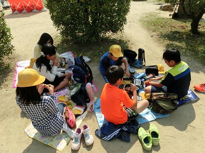 昼食は快晴の下、大阪城公園内で班のみんなと一緒においしくいただきました。