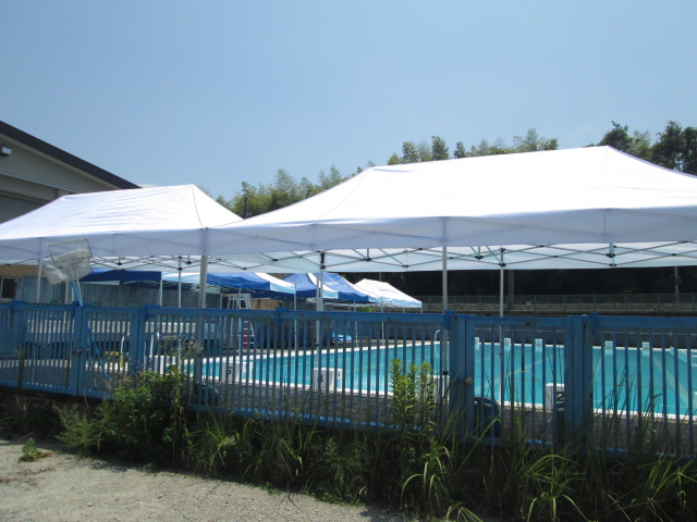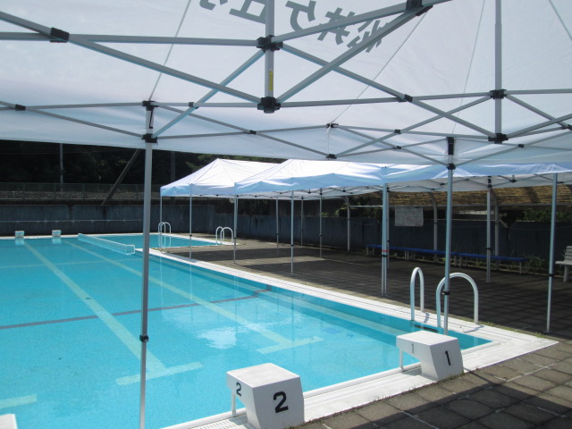 保護者・地域の皆様におかれましては、水泳学習を行うにあたり、連日の暑さでご心配をおかけしているところですが、本校では、プールサイドに大型テントを設置したり、水筒をプールサイドに持ち込み、水分補給を細目に行い、熱中症対策をしています。