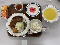 夕食は、ご飯と漬物、生野菜、ハンバーグ、丸ごとポテト、手羽先黒コショウ焼き、大根梅の花、コーンスープ、オレンジジュースとボリューム満点です。