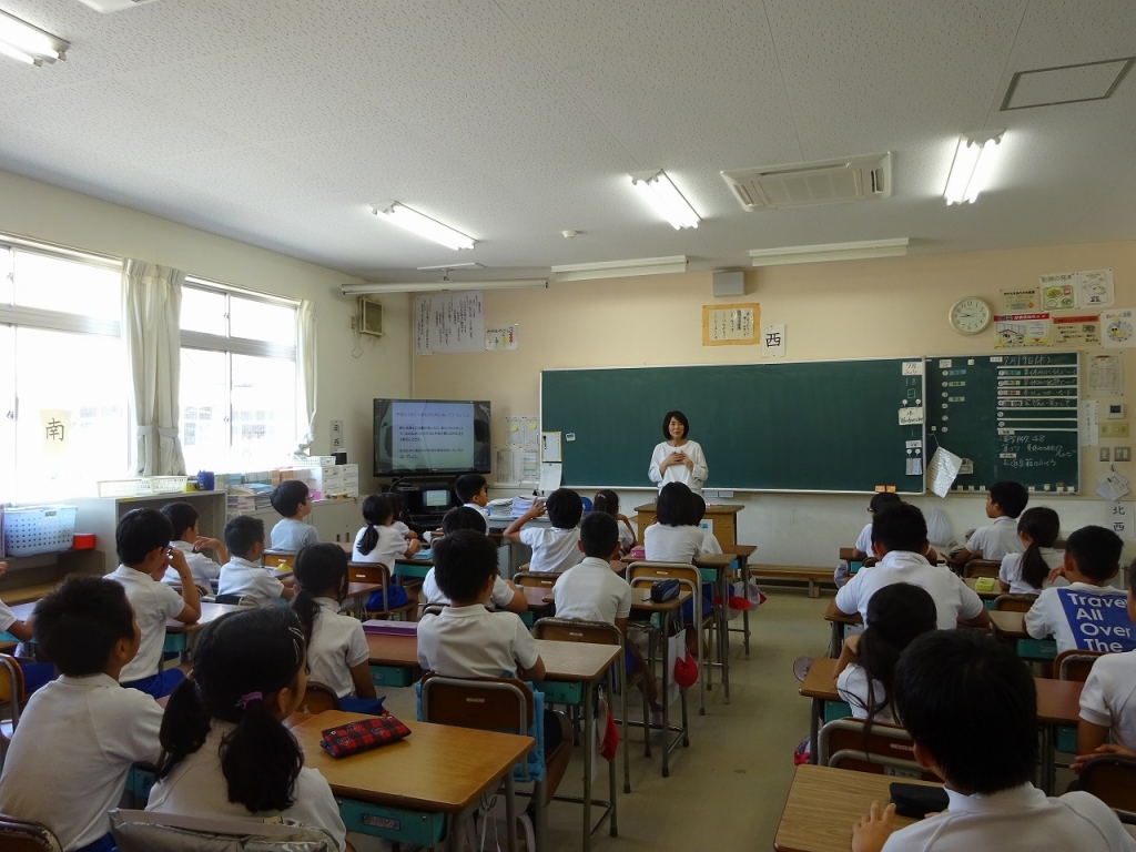 4年生は1時間ずつ、田辺中学校のスクールカウンセラーの先生に来ていただいて、不安を抱えた時にどのような症状が出たり、その症状に対してどのように対処すればよいかのかをお話いただきました。呼吸法や座り方などのお話を聞き、実際に体験をしました。