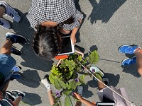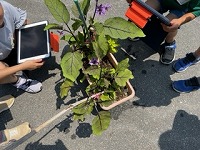 2年生が、生活科の学習で自分達が育てている野菜の観察をしました。この日は、夏野菜のナスやししとう、オクラの様子をタブレットを活用して写真に撮りながら、観察を行いました。子ども達は、梅雨の合間の晴れた日に、大きくなった野菜の様子をしっかり観察していました。