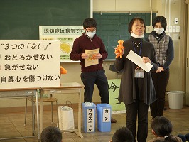 6年生は、本日の午前中に京田辺市社会福祉協議会から3名の方を招いて、「認知症サポート養成講座」を実施しました。