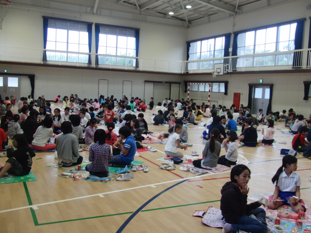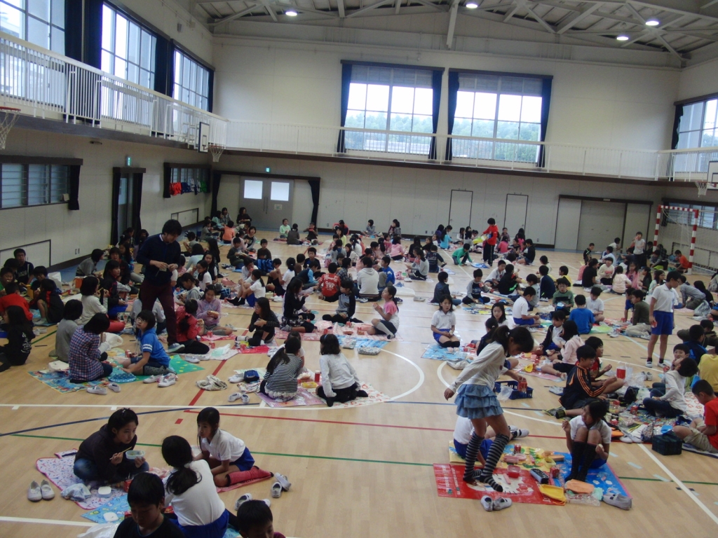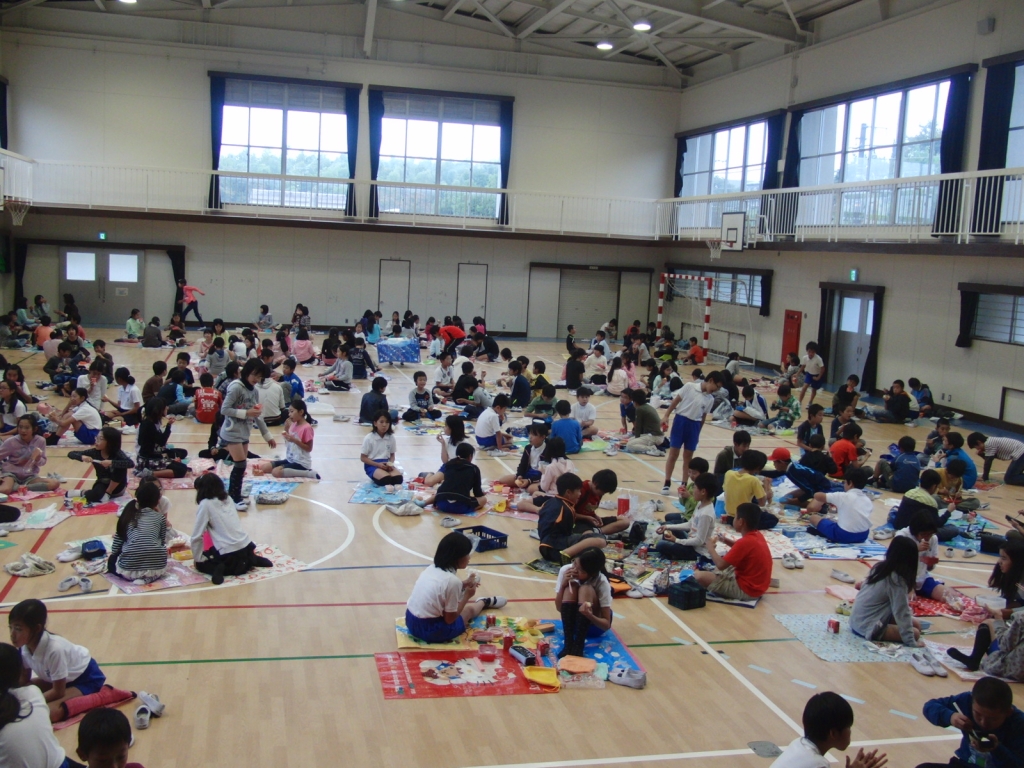 本日はお弁当給食です。給食をお家から持ってきたお弁当に詰め、教室と違う場所で食べる行事です。