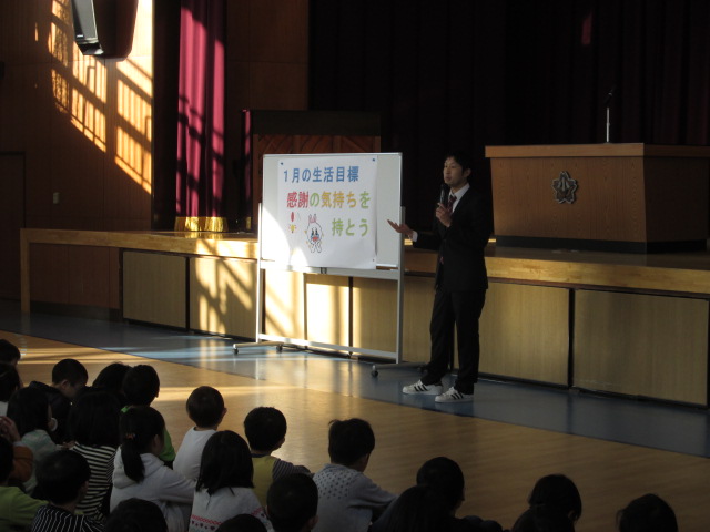 次に、1月の生活目標について、担当の先生からお話がありました。1月の生活目標は「感謝の気持ちを持とう。」です。1月は給食感謝週間もあります。自分たちの生活を支えてくれる色々な方々へ感謝の気持ちを持って、一日一日を大切に過ごしてほしいです。