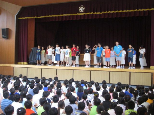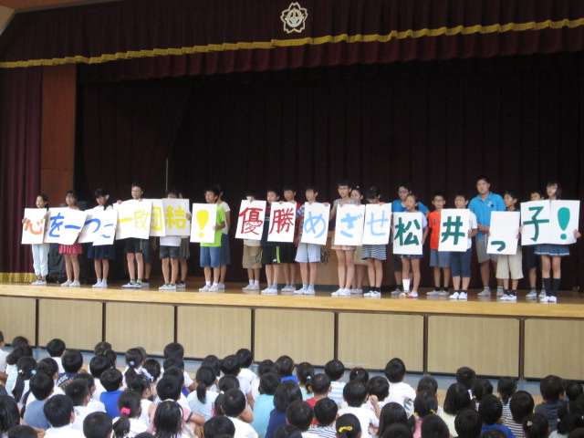 まず初めに、運営委員会から運動会のスローガンの発表がありました。今年のスローガンは、「心を一つに一致団結!優勝めざせ松井っ子!」です。赤・白・青・黄・緑組、各色それぞれ一致団結し、運動会の取組をがんばってほしいです。