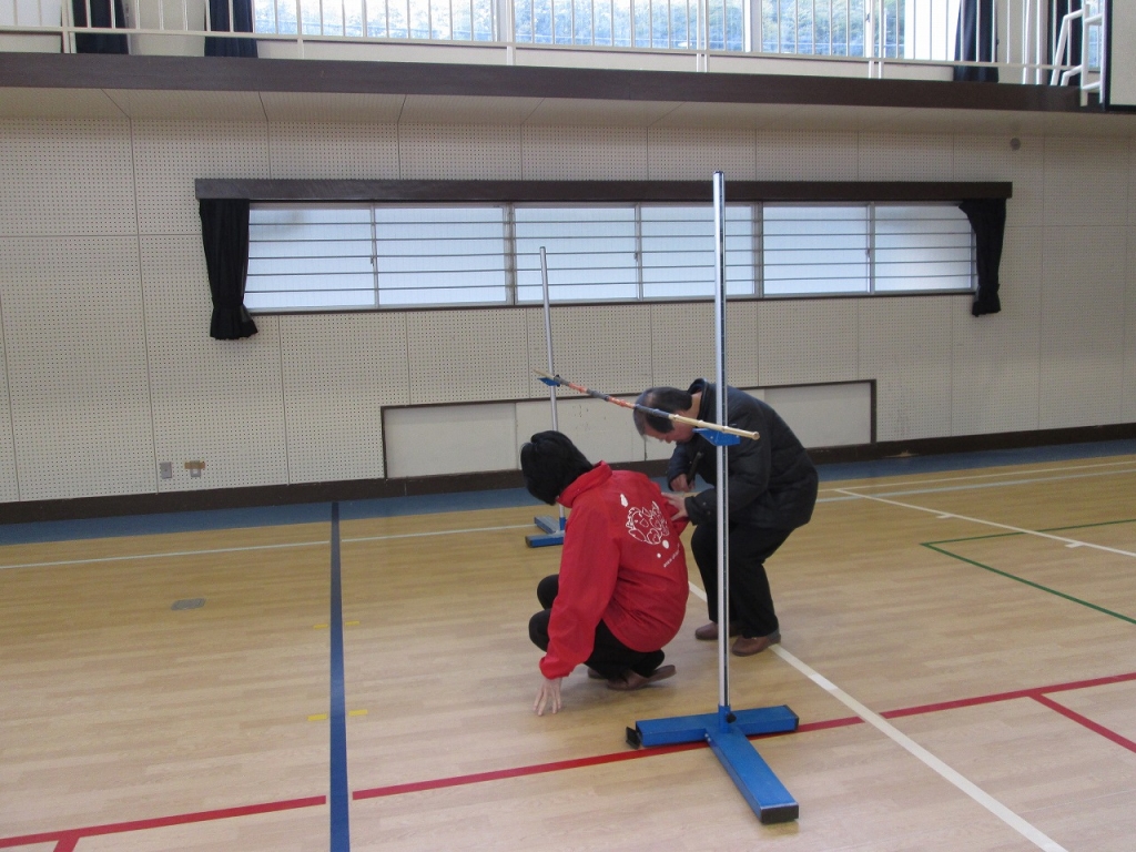 2人ペアとなり、「アイマスクをして歩く人」と「手引きをする人」に分かれ、体育館に設置された障害を歩きました。