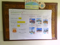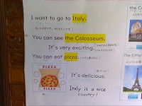 国際理解教育啓発の一環として、北校舎廊下の掲示板に国際理解に関する掲示を行っています。現在は「行ってみたい国とその理由を伝え合おう」というテーマで掲示をしています。子ども達は掲示物を見ながら、外国に思いをはせるともに、行ってみたい国の言い方を学んでいました。